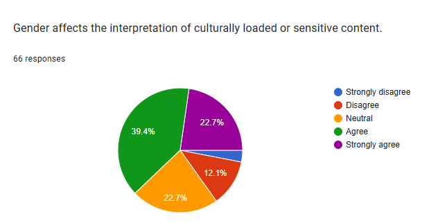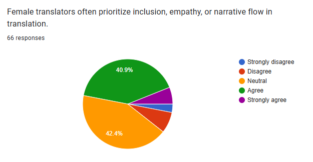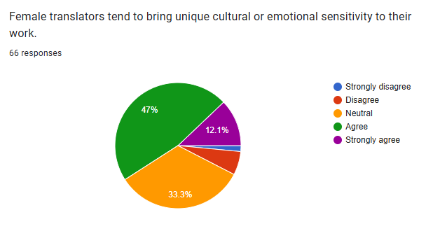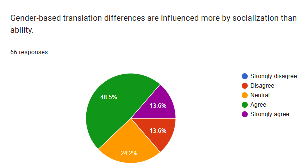 The majority of respondents agree that gender-based translation differences are more influenced by socialization than ability. This suggests a prevailing belief among the surveyed group that social factors play a more significant role than inherent capabilities in explaining any differences observed in translation based on gender.