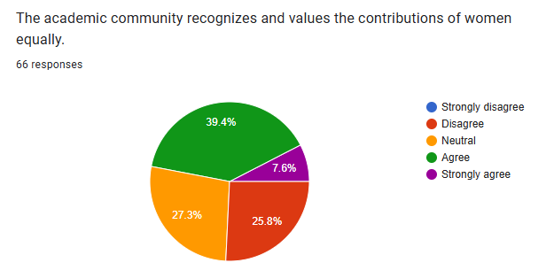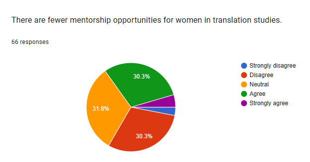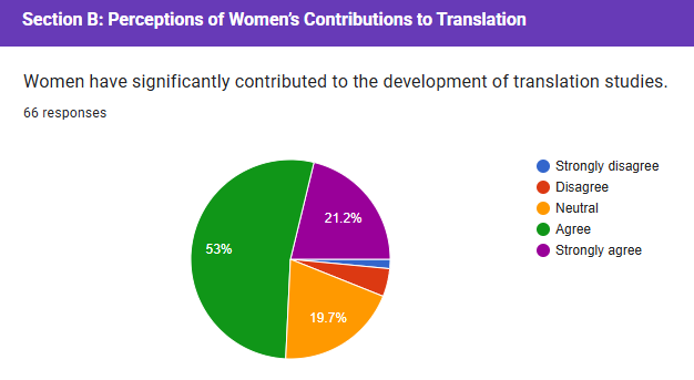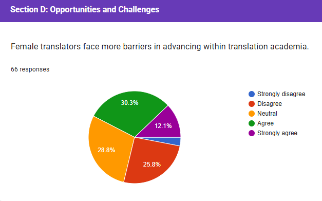 In Section (D), the survey results indicate a divided opinion among regarding the availability of mentorship opportunities for women in translation studies. Respondents express a positive view, suggesting a significant portion believes in the importance of gender awareness in translator education. A significant majority of respondents strongly agree that gender awareness can improve the quality and ethics of translation practices.