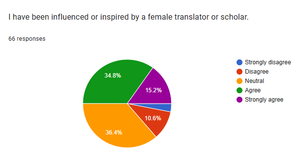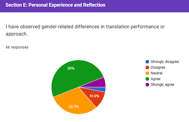 The last section (E) shows that a large majority of the respondents either perceived gender-related differences in translation or held no strong opinion against it. While a significant portion remained neutral, a combined majority of respondents either strongly disagreed or disagreed, suggesting that a substantial number have not been influenced or inspired by a female translator or scholar, according to this survey.