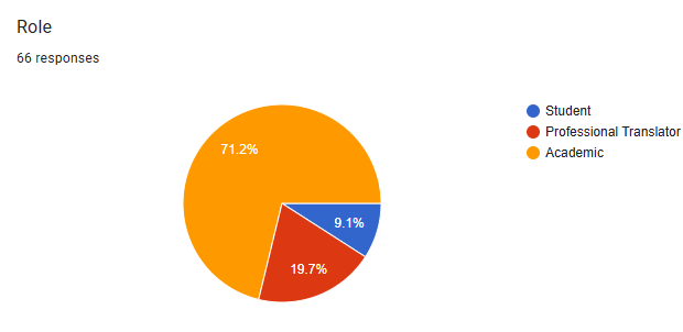 Academics comprise the largest group, representing 71.2% of the total respondents, which corresponds to approximately 47 individuals. Professional Translator represent the second-largest group, accounting for 19.7% of the responses, which translates to about 13 individuals while students form the smallest group, making up 9.1% of the total, corresponding to approximately 6 individuals.