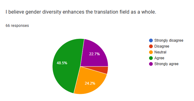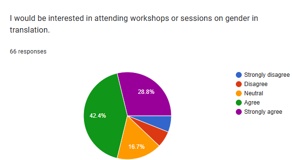 The majority of respondents agree or strongly agree that gender diversity enhances the translation field. The survey indicates a strong positive interest in workshops or sessions on gender in translation, with the majority of respondents either agreeing or strongly agreeing to attend.