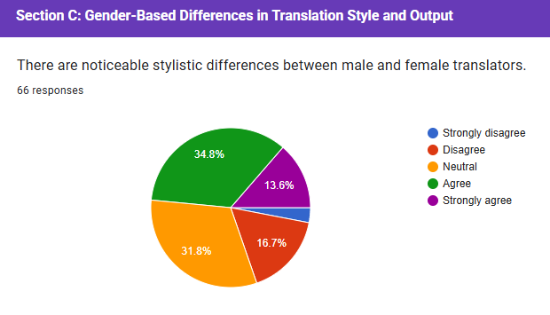 Section (C) tackles gender-based differences in translation style and output, specifically stylistic differences between male and female translators. A significant portion of respondents believe there are noticeable stylistic differences between male and female translators