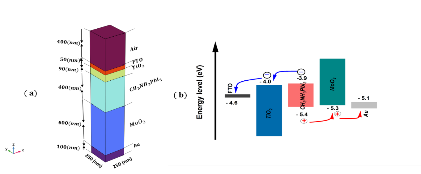 A planar n-i-p perovskite solar cell was simulated using the Semiconductor Module within COMSOL Multiphysics. The simulated device architecture consists of the following layers: Fluorine-doped Tin Oxide (FTO) as the front transparent contact, a layer of TiO2​ as the ETL, a CH3​NH3​PbI3​ perovskite layer as the active absorber, a ​​ layer as the HTL, and a Gold (Au) back contact. Figure 1(a) represents schematic structure of Perovskite Solar Cell made of/Au.