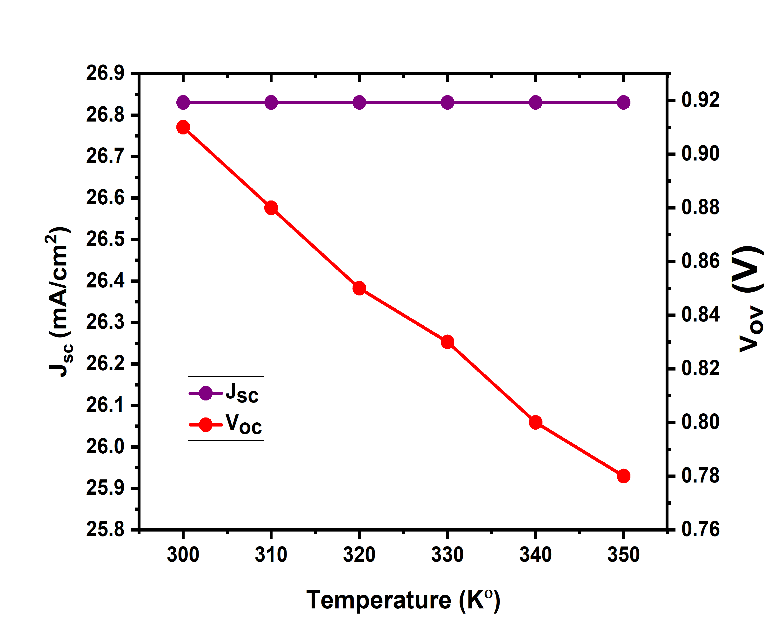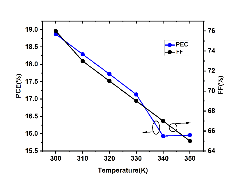 Studying solar cell performance under realistic operating conditions is essential, as the cell’s temperature naturally rises under solar illumination. The simulation results revealed that the performance of the perovskite solar cell is adversely affected by an increase in temperature.