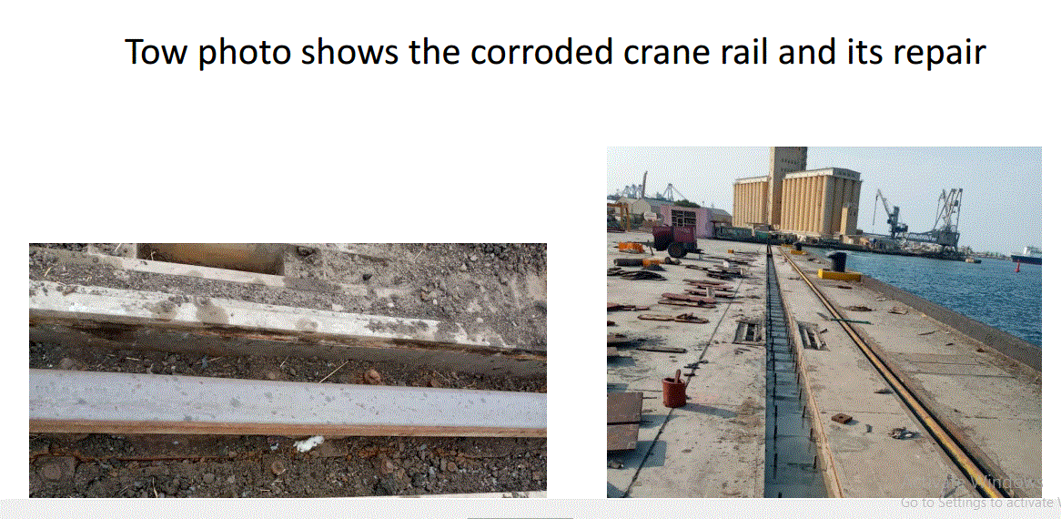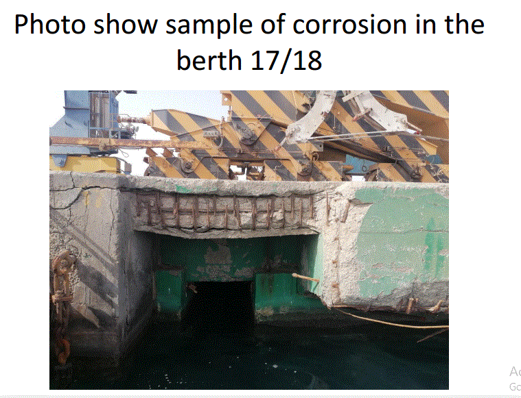 • Reinforcement Corrosion: Corrosion of steel was evident in the crane rails of Berths 13-14, the extension of Berths 17-18, and the four rails of Slipway No. 1.