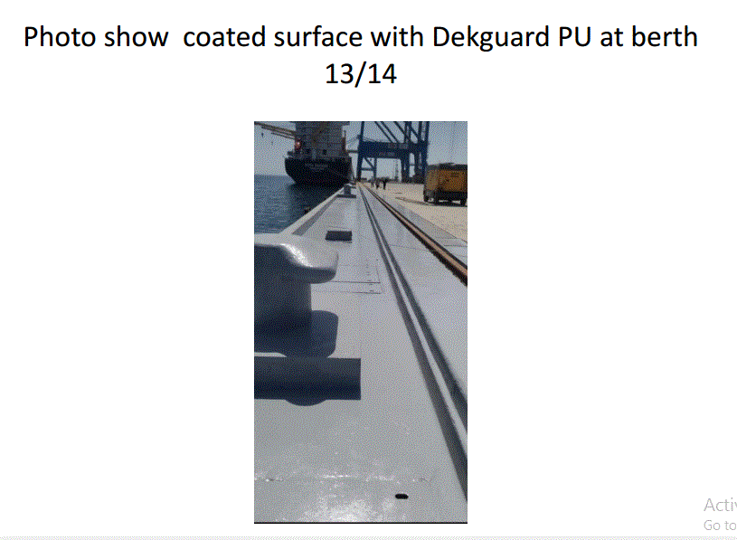 • Protective Coating: To prevent future chloride ingress, Fosroc Dekguard PU, a high-performance polyurethane coating, was applied to the top surface of Berths 13-14 over an area of 3905 m² (5m width from the apron edge).