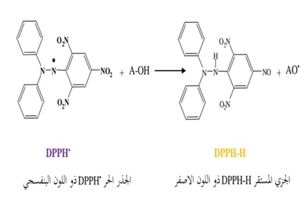 يعتمد هذا الاختبار على قياس قابلية او قدرة مضادات الاكسدة على اقتناص الجذر الحر حيث يتم اختزال الالكترون المنفرد لذرة النيتروجين في DPPH (2,2-diphenyl-1picrylhydrazyl) عند طريق استقبال ذرة الهيدروجين من مضادات الاكسدة ويتحول الى الهيدرازين المقابل بعدها يحدث التفاعل اللوني للجذر DPPH ذو اللون البنفسجي الذي يتحول الى جزئية مستقرة DPPH-H وهي مادة صلبة ذو لون اصفر ويستعمل هذا الاختبار في تقييم نشاط المركبات التي تعمل كمضادات اكسدة ( .(Bahar et al.,2013