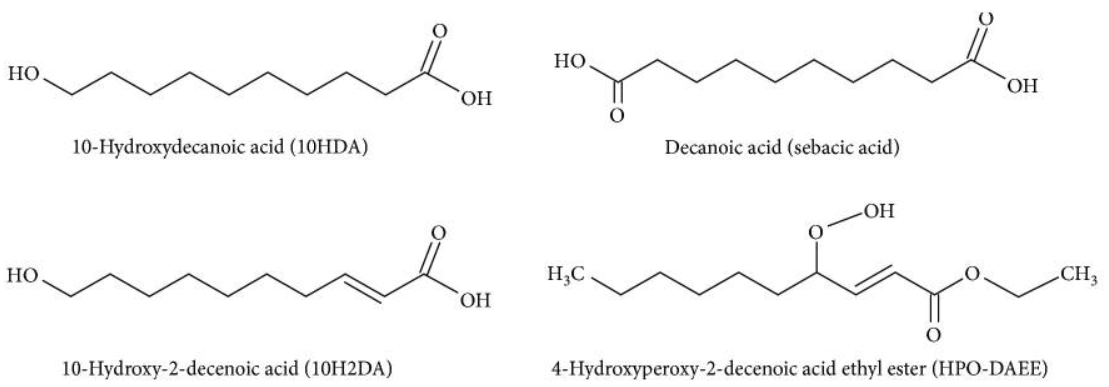 Yu, X., Tu, X., Tao, L., Daddam, J., Li, S., and Hu, F. (2023). Royal Jelly Fatty acids: chemical composition, extraction, biological activity, and prospect. Journal of Functional Foods, 111, 105868. https://doi.org/10.1016/j.jff.2023.105868