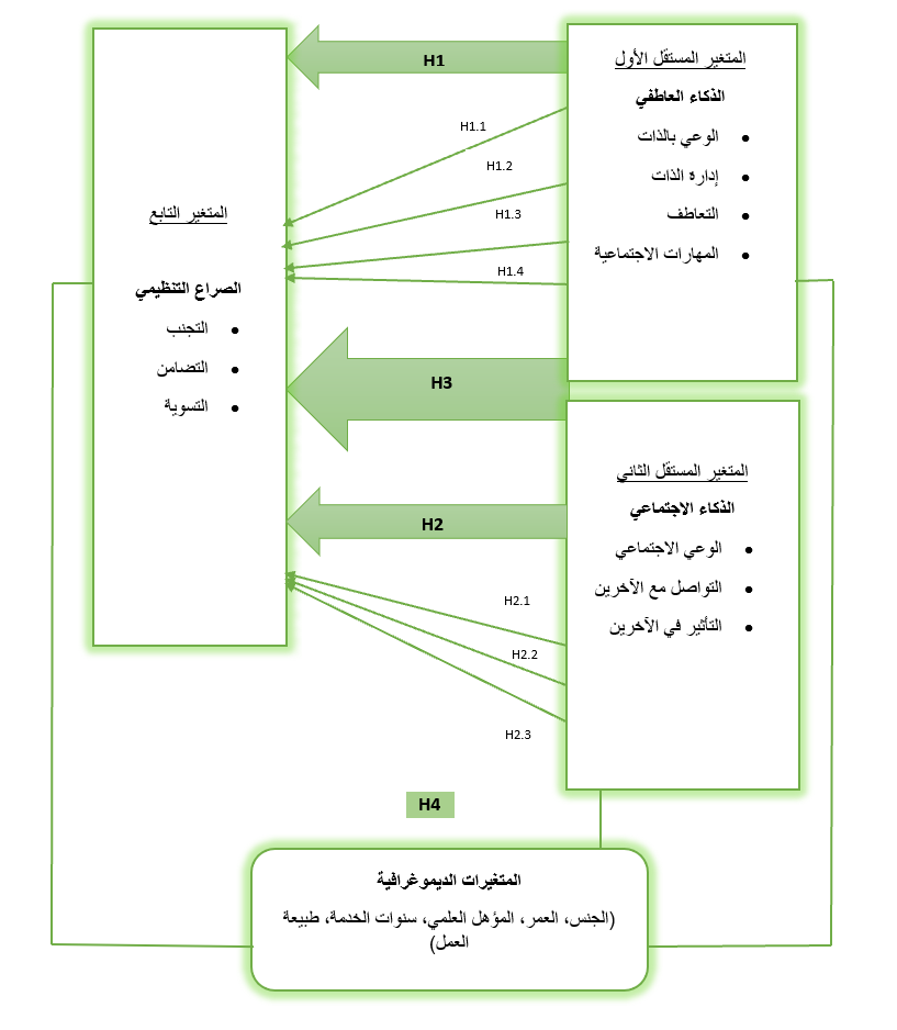 كما حرصت الدراسة على تضمين الأبعاد الأكثر تداولاً في الأدبيات السابقة، حيث شمل الذكاء العاطفي أبعاد: الوعي بالذات، إدارة الذات، التعاطف، والمهارات الاجتماعية، في حين تضمن الذكاء الاجتماعي أبعاد: الوعي الاجتماعي، التواصل مع الآخرين، والتأثير في الآخرين. أما الصراع التنظيمي، فقد تم قياسه من خلال استراتيجيات التجنب، والتسوية، والتضامن.