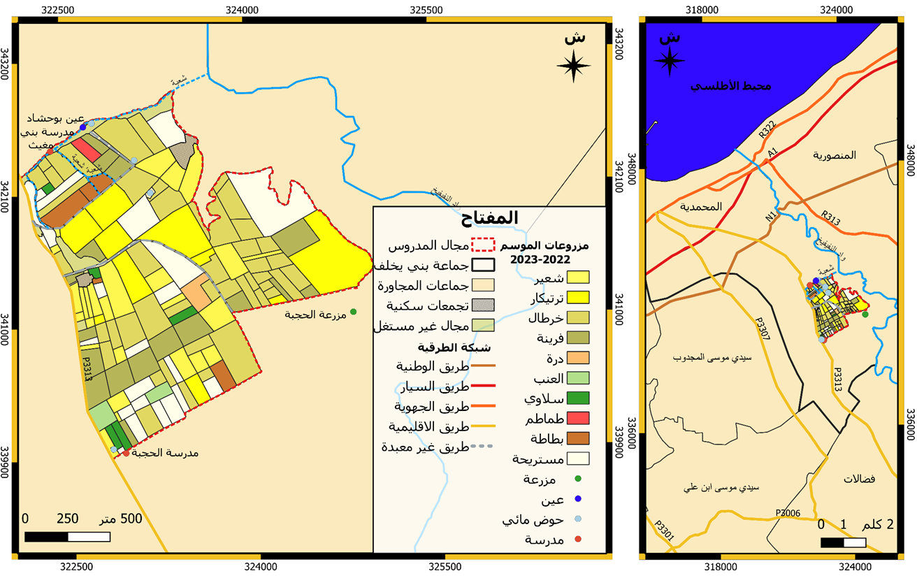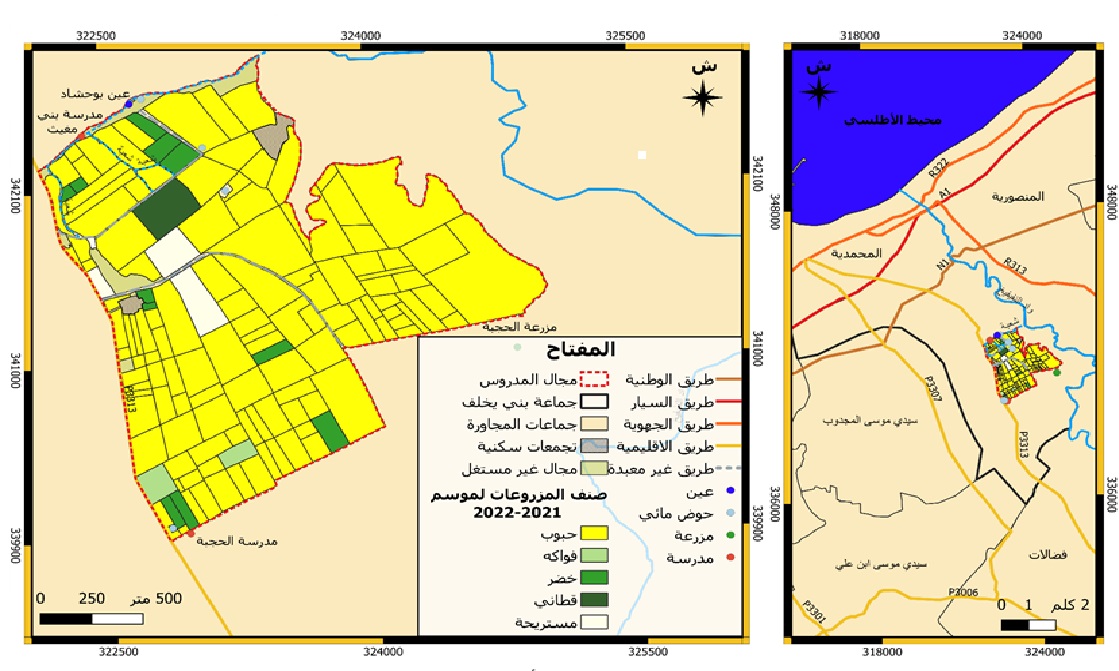 تم الاعتماد على الفلاح لمعرفة صنف ونوع المزروعات التي كانت تشغل المشاراة الزراعية المستغلة خلال الموسم الفلاحي 2022، وبناء عليه تم إنتاج كل من خريطة (الشكل رقم14) التي تمثل خريطة توزيع أصناف المزروعات التي تتواجد بمنطقة الحجبة، و(الشكل رقم 15)، التي تمثل خريطة أنواع المزروعات لنفس الموسم، بعد دراستنا للخريطتين يتبين أن لدينا أربعة أصناف يمكن تفصيلها في الآتي: