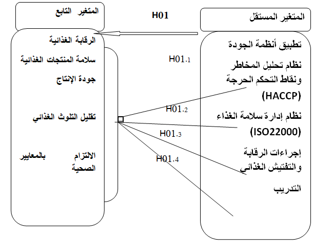 H0 (الفرضية العدمية): لا يوجد أثر إيجابي ذو دلالة إحصائية لتطبيق أنظمة الجودة في تعزيز الرقابة الغذائية داخل المصانع والمعامل الغذائية عند مستوى الدلالة (α ≥ 0.05).