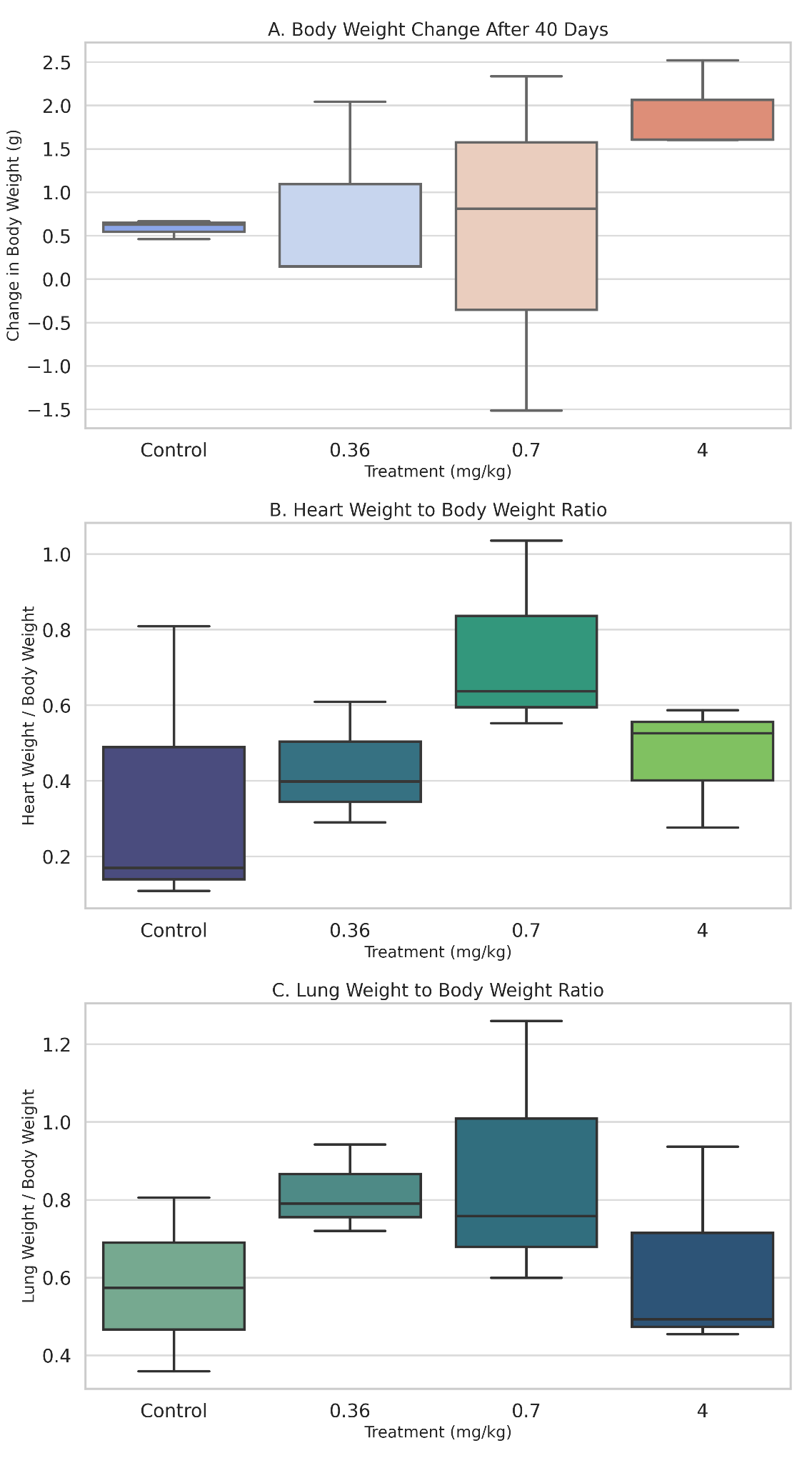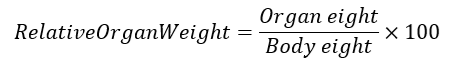 At the end of the study, animals were anesthetized using light ether and euthanized via cervical dislocation. The heart and lungs were carefully excised, rinsed in cold normal saline, blotted dry, and weighed. Relative organ weights were calculated using the formula:
