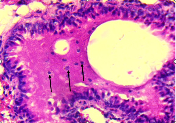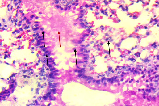 Bronchiolar epithelium appeared partially detached, and several lung sections displayed eosinophilic proteinaceous material within the airway lumens. Alveolar spaces were noticeably reduced, and focal hemorrhages were present, indicating increased capillary permeability or endothelial injury (Figure 3).
