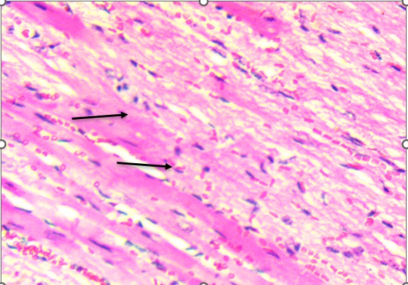 Histological examination of the heart revealed well-preserved myocardial architecture in both control and treated animals (Figure 2A–B). Myofibrils were regularly aligned, cross-striations were intact, and nuclei were centrally placed, findings consistent with the absence of cellular injury or inflammatory infiltration. Even at the highest extract dose, the myocardium exhibited no signs of necrosis, edema, or vascular compromise, indicating that D. stramonium did not induce structural cardiotoxicity under these experimental conditions. This aligns with clinical observations of Datura poisoning in humans, where tachycardia and arrhythmias are common yet typically reversible, reflecting autonomic dysregulation rather than direct myocardial damage (Krenzelok, 2010; Al Shaikh & Sablay, 2005).