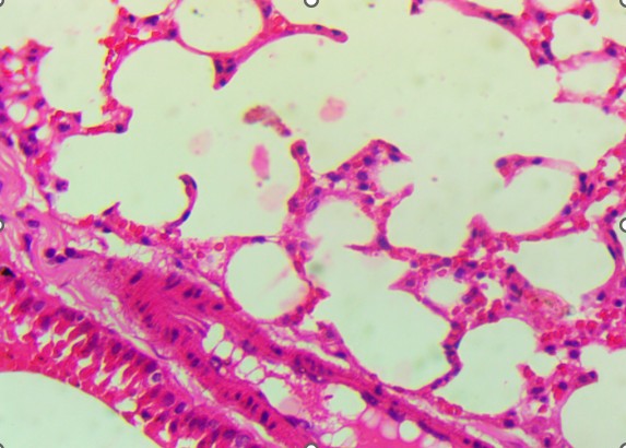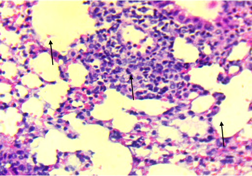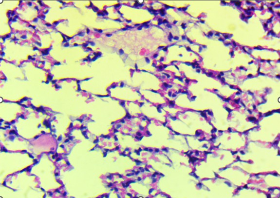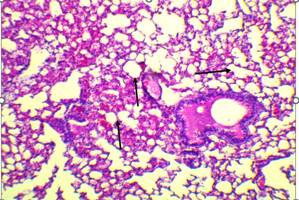 In the mid-dose group (0.7 mg/kg), histopathological changes became more apparent. The alveolar septa were mildly thickened, and there was evidence of focal inflammatory infiltration, particularly in the peribronchiolar regions. These findings suggest early-stage toxic alveolitis, possibly mediated by oxidative or inflammatory mechanisms triggered by the plant’s alkaloids. The high-dose group (4 mg/kg) revealed the most prominent pulmonary lesions.