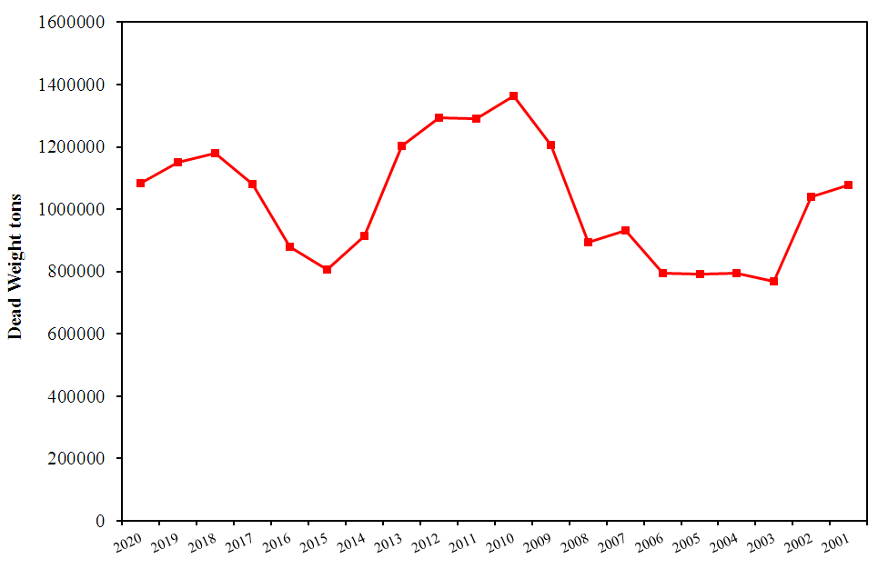 استنادا إلى ما جاء بالجدول رقم (1.2 ) والشكل رقم ( 1.2)، إن الحمولة الوزنية Dead Weight للسفن المسجلة تحت العلم القطري خلال الفترة( 2001-2020 ) تكون ذات نسب متغيرة وغير مستقرة، ويلاحظ بأنها تزداد فترة وتنخفض فترة أخرى، بعبارة أخرى، لوحظ بان هذه الحمولة خلال العشرون عام من(2001 إلى 2020 ) متغيرة ومتذبذبة، ففي عام( 2001 ) كانت الحمولة الوزنية للأسطول القطري البحري تعادل 1079000 طن ثم انخفضت الى 770000 طن في عام ( 2003)، لكن لوحظ بان الحمولة الوزنية للأسطول القطري البحري بدا بالزيادة حتى وصلت ذروتها في عام( 2010 ) إلى 1363440 طن، لكنها ما لبثت كثيرا إلا أن تراجعت في عام( 2014 ) حتى وصلت إلى 914496 طن ثم بعد ذلك بدأت ترتفع ويصعد المؤشر حتى وصلت الحمولة الوزنية للأسطول القطري البحري في (2020) إلى 1084957 طن.